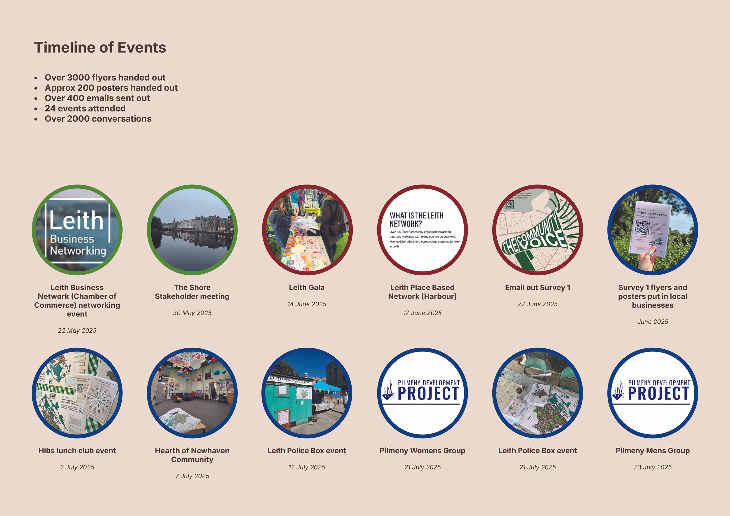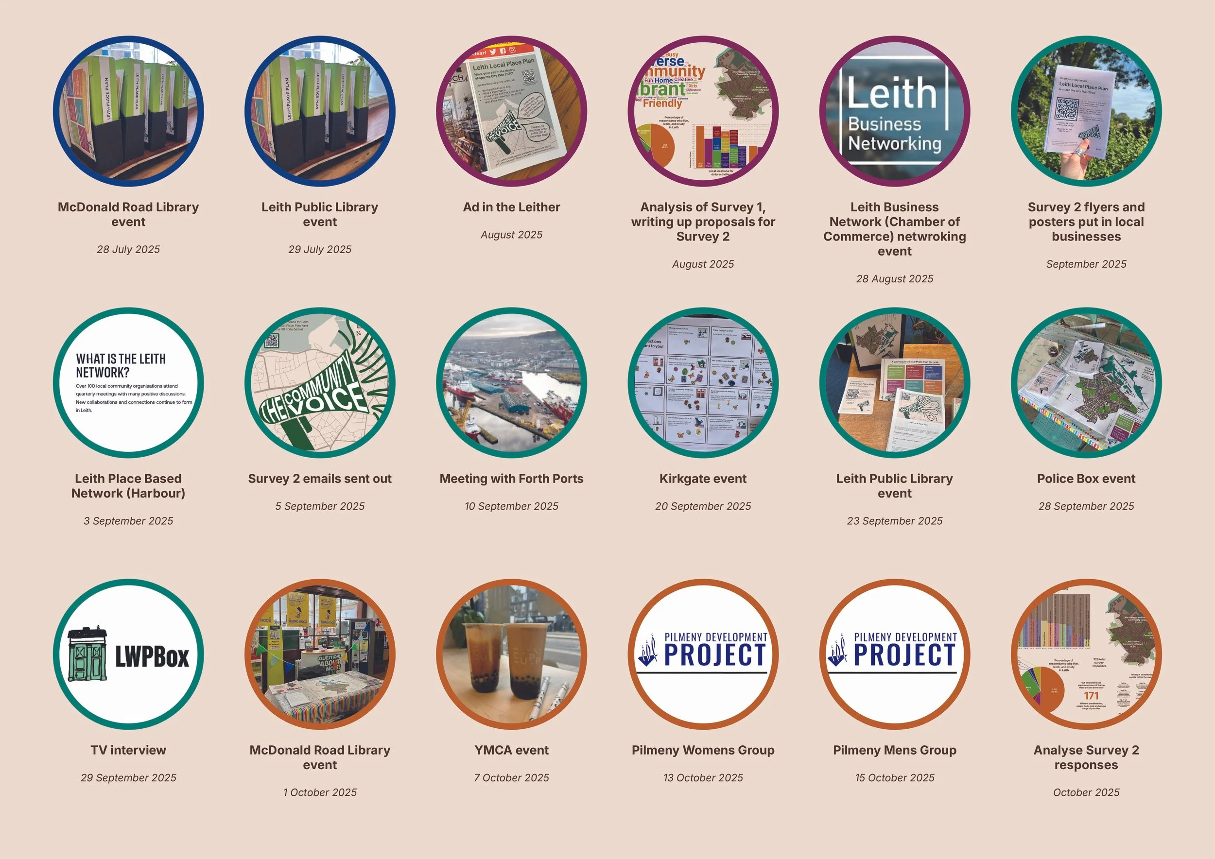 Our journey with the Leith Local Place Plan was split into two surveys. The first survey was carried out through July 2025. It aimed to get the over-arching views and opinions of the people of Leith and how they feel about their place here. The second survey was open through September and October 2025. It presented the suggested responses to the challenges reported in the first survey, and asked the community if they are happy with our suggestions whether they reflect their voices well. The surveys were hosted online, and we attended a series of events to get people’s views.